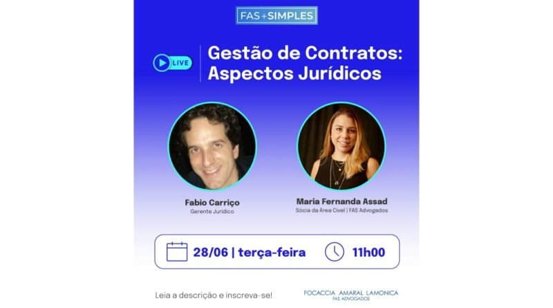 São Paulo, junho de 2022 – A gestão de contratos nas empresas é uma questão de extrema importância para o cumprimento dos diferentes aspectos jurídicos, principalmente para evitar problemas com a justiça. Assim, a próxima edição do FAS+Simples, que acontece nesta terça-feira (28), às 11 horas, vai abordar a gestão de contratos e os aspectos jurídicos. Realizado pelo Focaccia, Amaral e Lamonica Sociedade de Advogados (FAS Advogados), a inscrição para o webinar está disponível gratuitamente pelo link https://tinyurl.com/AspectosJuridicos.