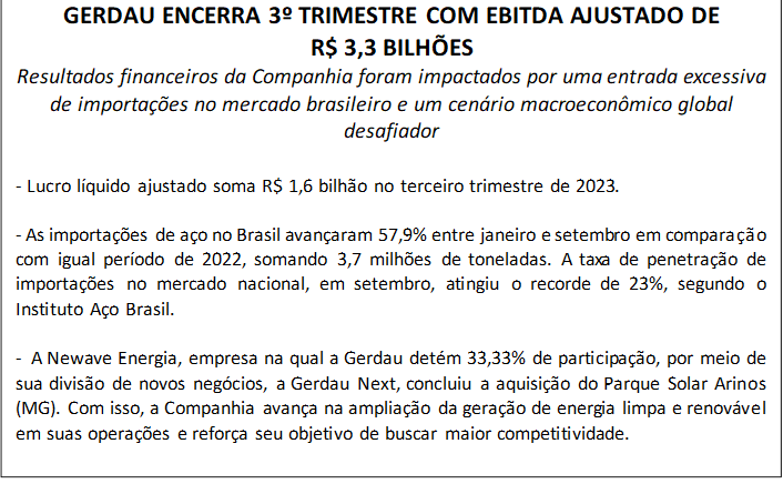 “A Gerdau obteve um Ebitda ajustado de R$ 3,3 bilhões entre julho e setembro 2023, entregando mais um trimestre de resultados financeiros sólidos, mesmo em meio a um cenário global desafiador, com queda nos volumes de demanda por aço. O mercado brasileiro, particularmente, foi bastante afetado no período por um aumento expressivo nas importações de produtos de aço, o que reforça a necessidade da aplicação de tarifas temporárias para assegurar a competitividade do aço brasileiro no curto prazo. Seguimos preparados para atender às necessidades atuais e futuras dos nossos clientes por meio de um portfólio de produtos, soluções e serviços inovadores e digitais em aço a partir das nossas operações no País”, afirma Gustavo Werneck, diretor-presidente (CEO) da Gerdau.