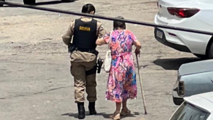 A gravação mostra a Soldado Rafaela Crispim auxiliando uma idosa a atravessar uma via pública movimentada.