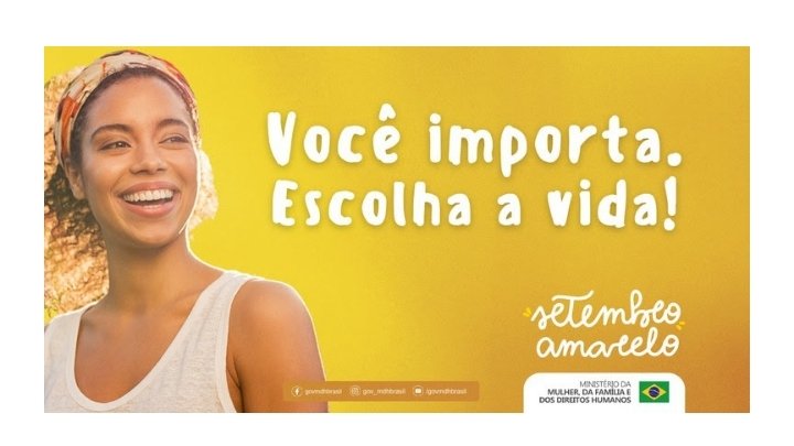 “Você importa. Escolha a vida!”. Com esse mote, o Ministério da Mulher, da Família e dos Direitos Humanos (MMFDH) inicia, nesta sexta-feira (02), a divulgação de ações nas redes sociais do órgão em referência ao Setembro Amarelo – mês de conscientização sobre o suicídio, a ser marcado pelo dia 10 de setembro, data marcada pelo Dia Mundial de Prevenção ao Suicídio.