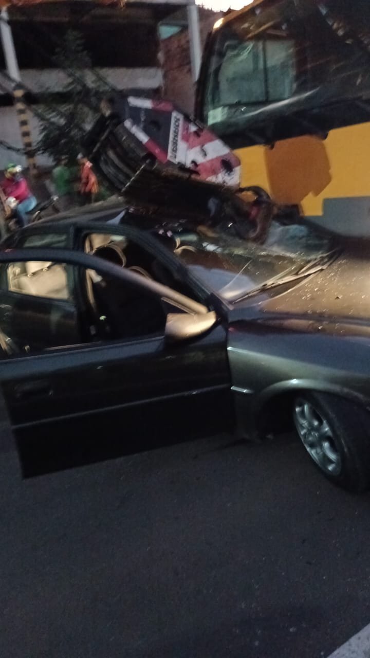 Segundo informações, com o impacto do acidente, a parte da ponta do guindaste rasgou o teto do veículo.