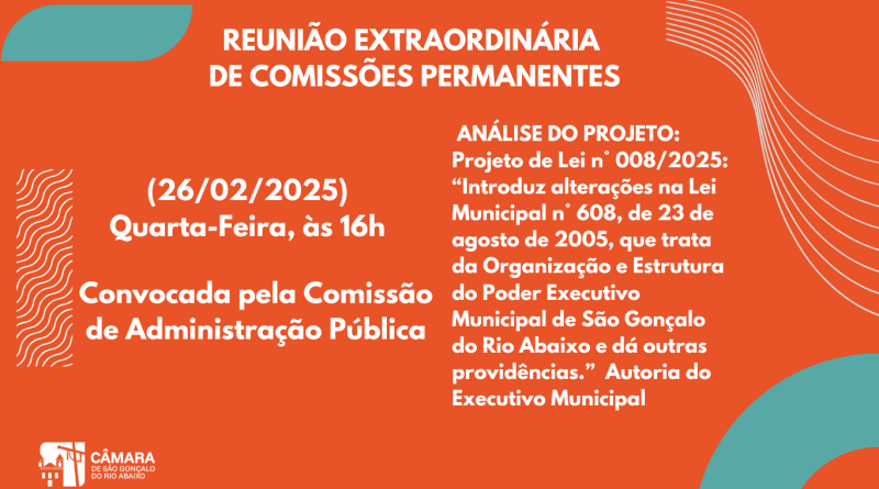 A Câmara de São Gonçalo realiza nesta quarta-feira, 26 de fevereiro, às 16h, nova Reunião Extraordinária de Comissões Permanentes, acerca do Projeto de Lei n° 008/2025, que “Introduz alterações na Lei Municipal n° 608, de 23 de agosto de 2005, que trata da Organização e Estrutura do Poder Executivo Municipal de São Gonçalo do Rio Abaixo e dá outras providências.” – Autoria do Executivo Municipal.