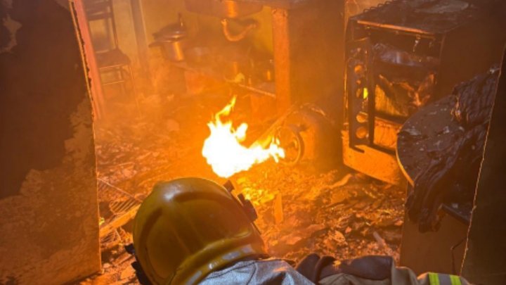 Ao chegar ao local, a Guarnição de Bombeiros constatou que as chamas haviam tomado toda a cozinha da residência, ocasionando a queda do telhado e comprometendo a estrutura. Diante da situação, foi acionada a Defesa Civil. A Guarnição de Bombeiros Militar, composta por quatro militares, realizou o combate ao incêndio utilizando uma linha direta, com aplicação de técnicas de combate direto e indireto, conseguindo extinguir totalmente as chamas.