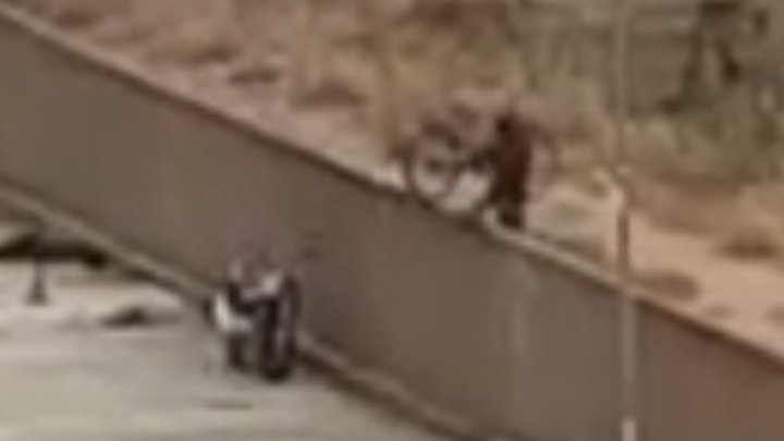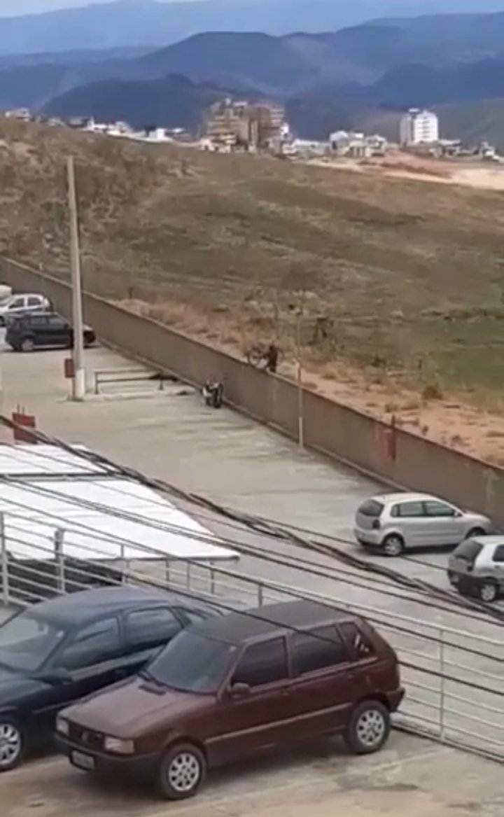 O ladrão sorrateiramente pegou a bicicleta, escalou o muro com a bike na mão, pulou o muro e tomou rumo ignorado.