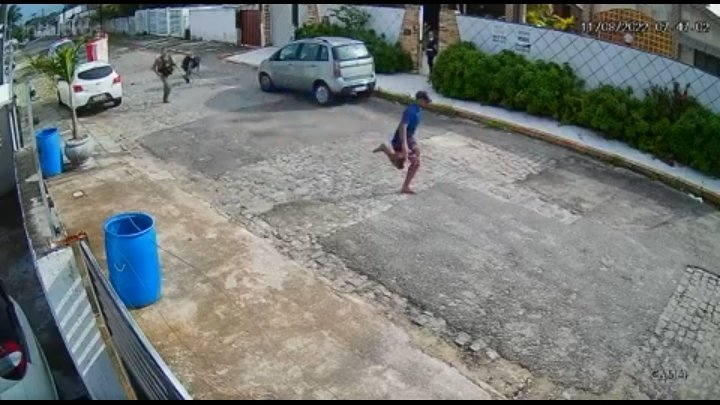 Imagens do circuito de segurança mostram o momento em que o homem foge da polícia após tentar invadir a casa da ex-companheira. Apesar da perseguição, ele conseguiu fugir.