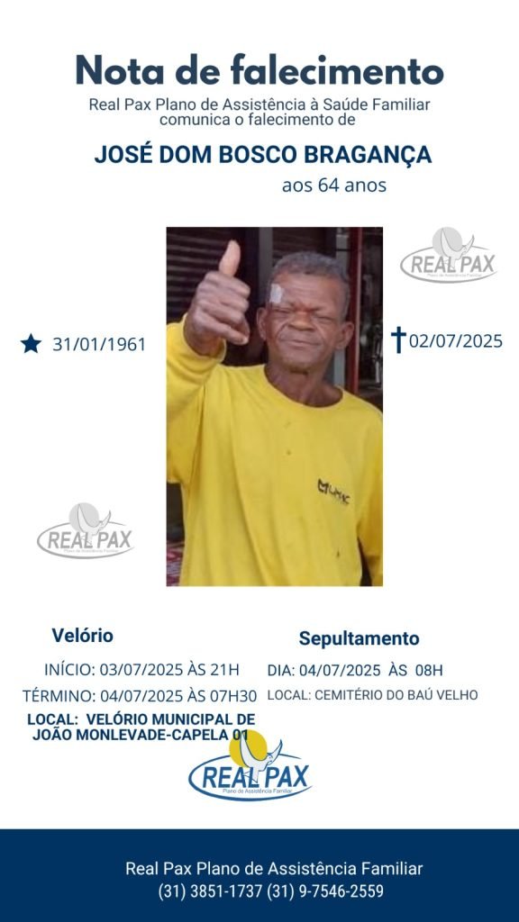 O velório de José Dom Bosco Bragança ou Zoinho terá início às 21 horas de hoje no velório municipal, e o seu sepultamento será amanhã (04) às 08:00 horas da manhã no cemitério do Baú Velho.