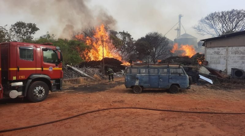 No local, constatou-se que o incêndio em vegetação atingiu uma fábrica de paletes, a qual possuía grande volume de madeira armazenada tanto no interior do galpão quanto na parte externa.
