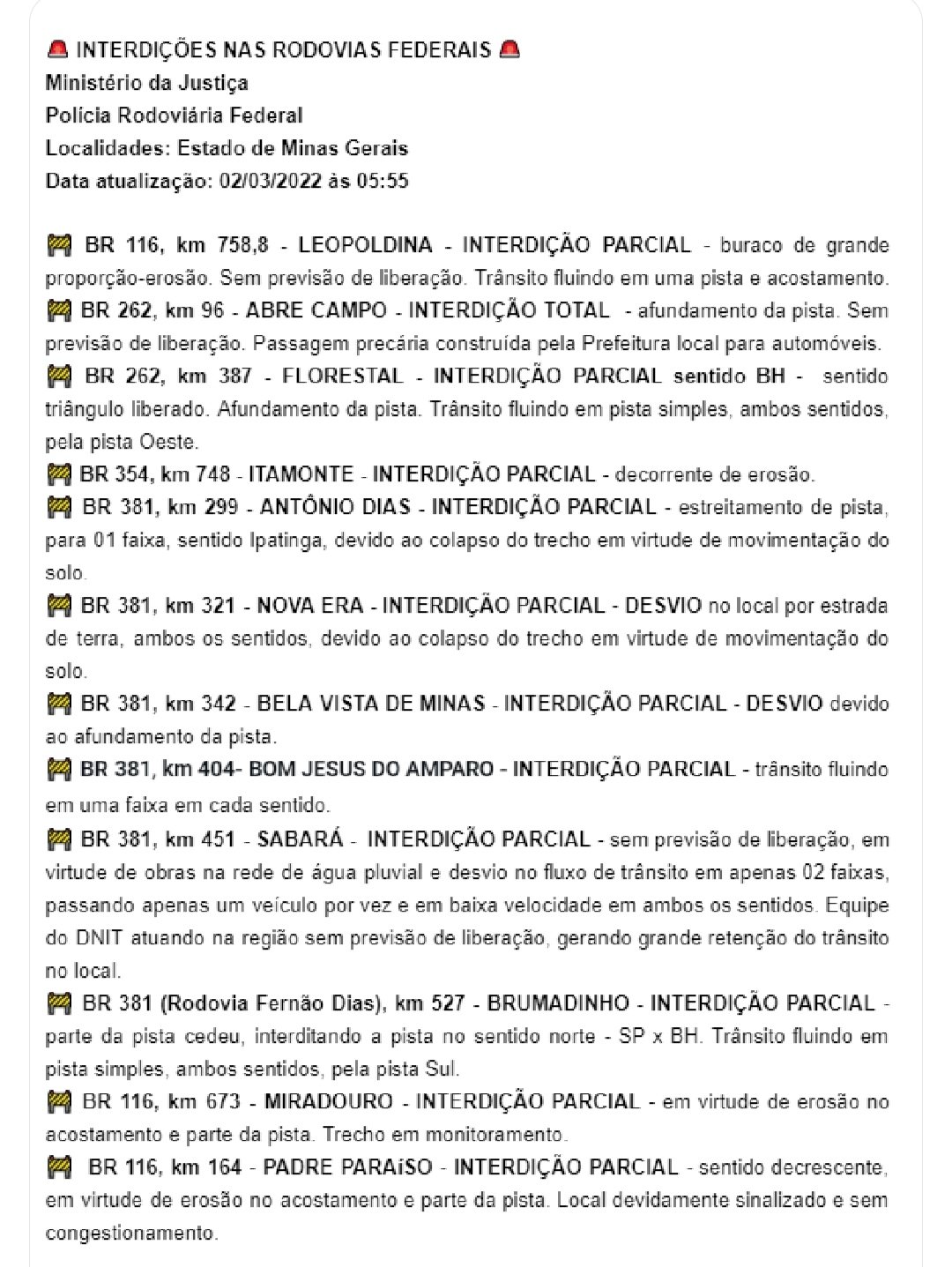 Interdições nas rodovias federais de Minas Gerais 02/03/2022