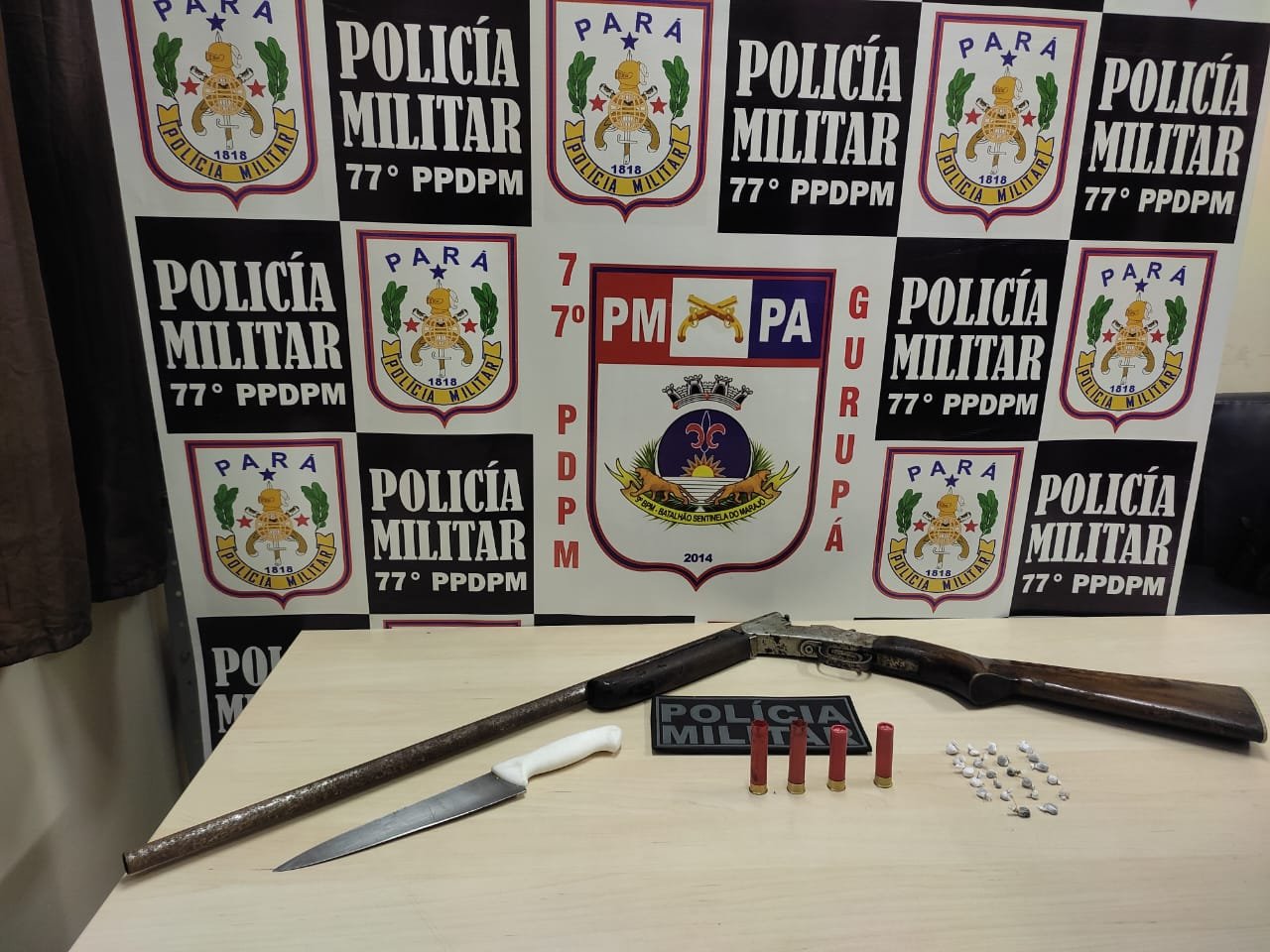 Por volta das 04:00 esta GU de serviço recebeu uma denúncia anônima onde foi relatado que no centro da cidade tinha um indivíduo oriundo da cidade de Macapá traficando entorpecentes e portando uma arma de fogo.