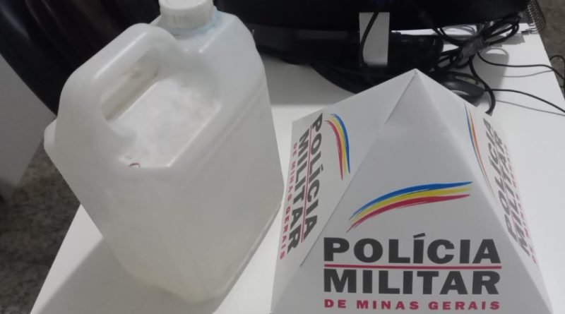 – Um galão de material plástico com líquido aparentando ser álcool em seu interior.
