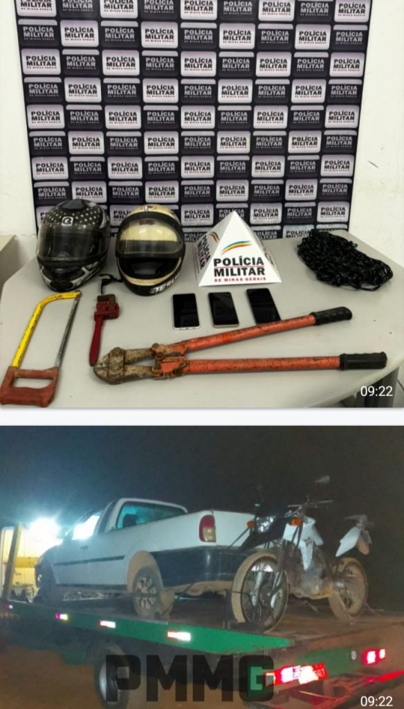 Os militares foram acionados pela equipe de vigilância de uma empresa , que flagrou a presença de invasores por meio das câmeras de monitoramento. No local, foram encontrados uma caminhonete e uma motocicleta abandonadas, ambas com placas adulteradas, além de ferramentas que seriam utilizadas na ação criminosa, capacetes e um celular pertencente a um dos suspeitos.