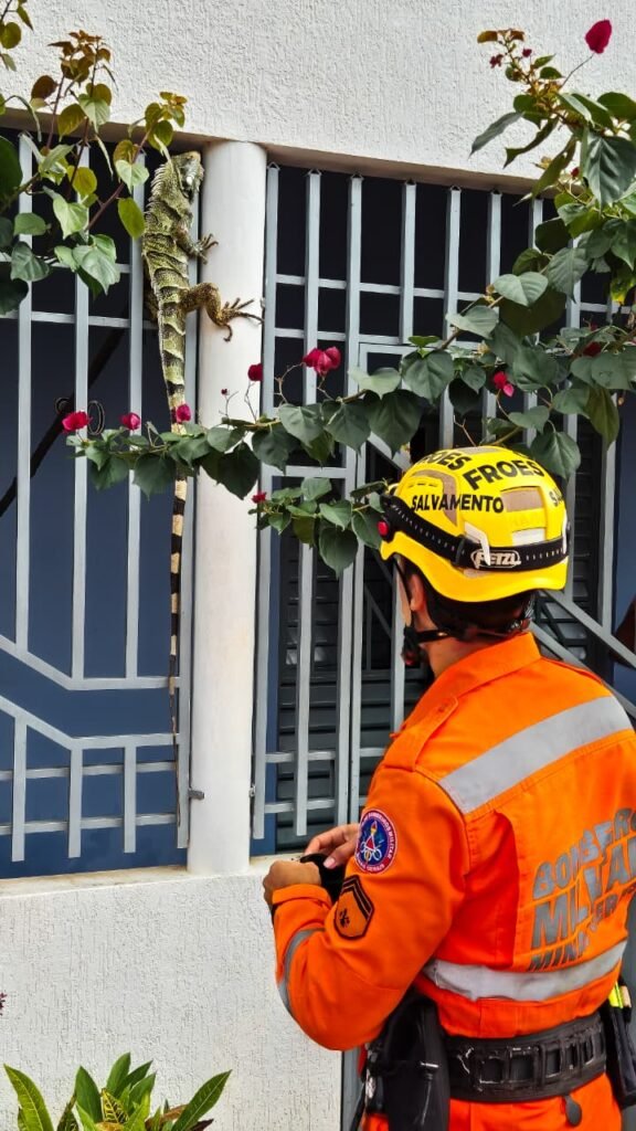 A moradora relatou que se assustou com o tamanho de uma iguana que estava na grade do portão de sua residência e imediatamente acionou o Corpo de Bombeiros.