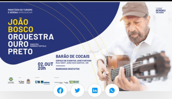 ? Música, cultura e talento… Tudo isso na apresentação do cantor e compositor João Bosco com a Orquestra Ouro Preto, em um patrocínio da empresa Gerdau e apoio da Prefeitura de Barão de Cocais. O show acontecerá no próximo sábado, dia 02 de outubro, no Espaço de Eventos José Furtado, às 20 horas.