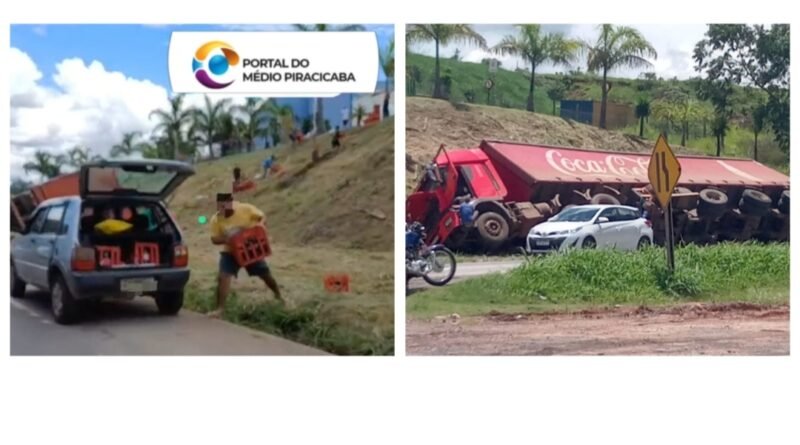 João Monlevade: carreta da Coca-Cola tomba e a turma do saque está agindo