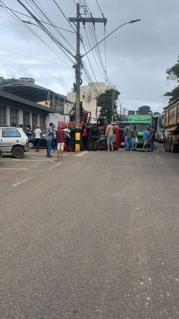 Onde um veículo que estava descendo sentido Bela Vista de Minas, capotou e ficou cravado no poste.