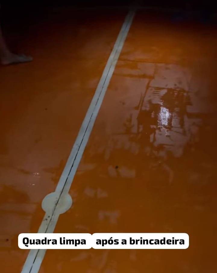 Uma pessoa que pratica capoeira com várias pessoas no local, disse do trabalho que foi para a prefeitura de pintar a quadra e depois virem e fazer uma coisa dessas.