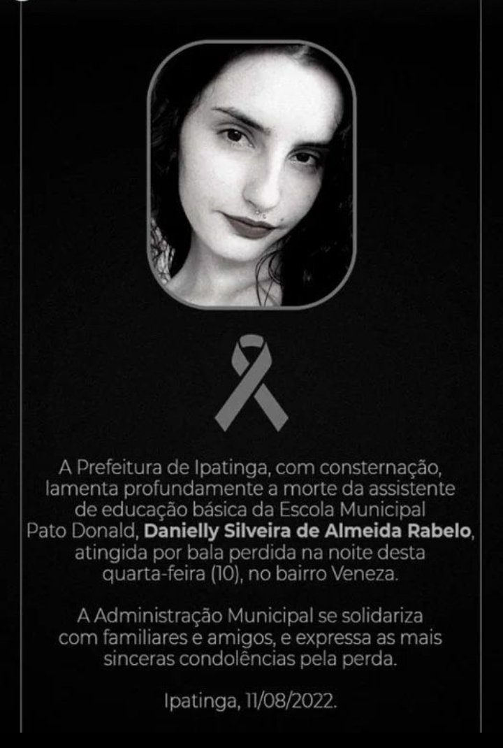 “A Prefeitura de Ipatinga, com consternação, lamenta profundamente a morte da assistente de educação básica da Escola Municipal Pato Donald, Danielly Silveira de Almeida Rabelo, atingida por bala perdida na noite desta quarta-feira (10), no bairro Veneza. A Administração Municipal, se solidariza com familiares e amigos, e expressa as mais sinceras condolências pela perda”.