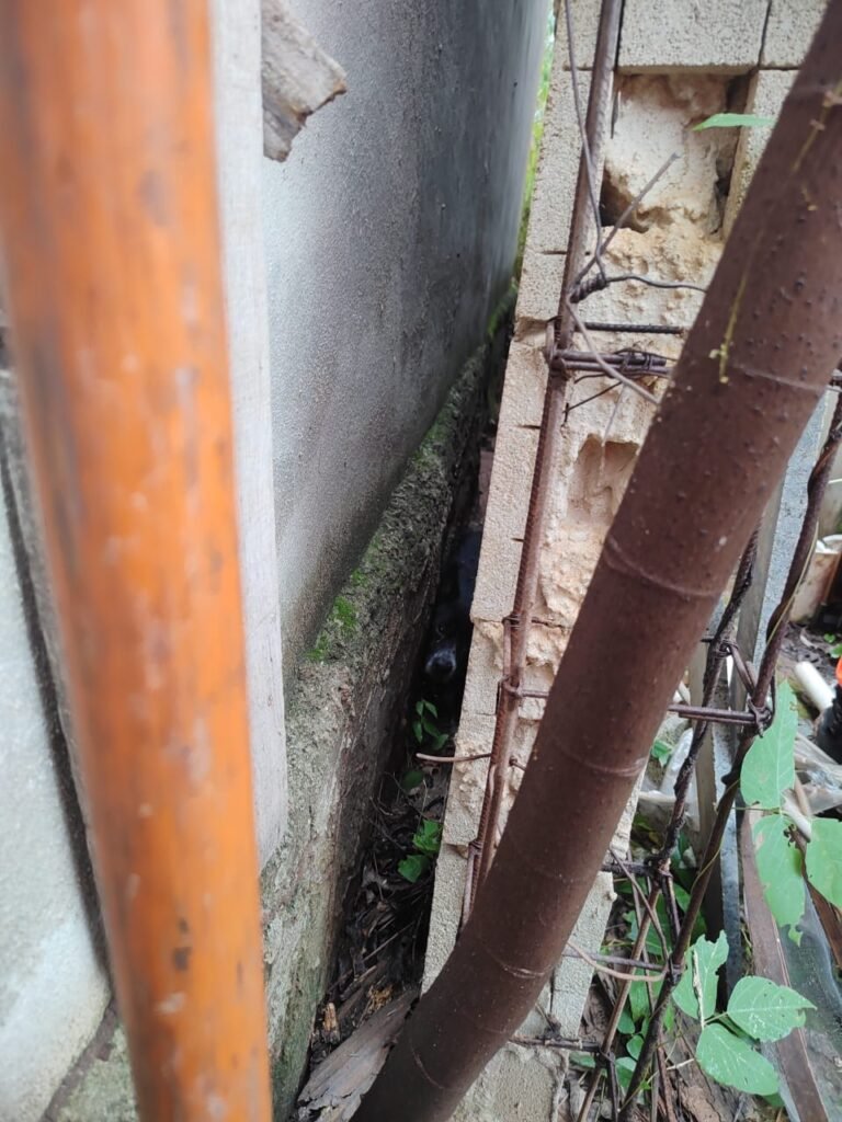 Um cão de médio porte, sem raça definida (SRD), encontrava-se preso entre o muro da residência da solicitante e a parede do imóvel vizinho.