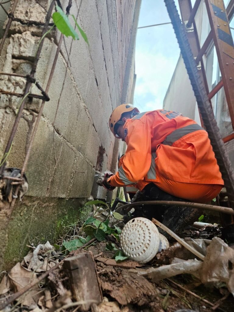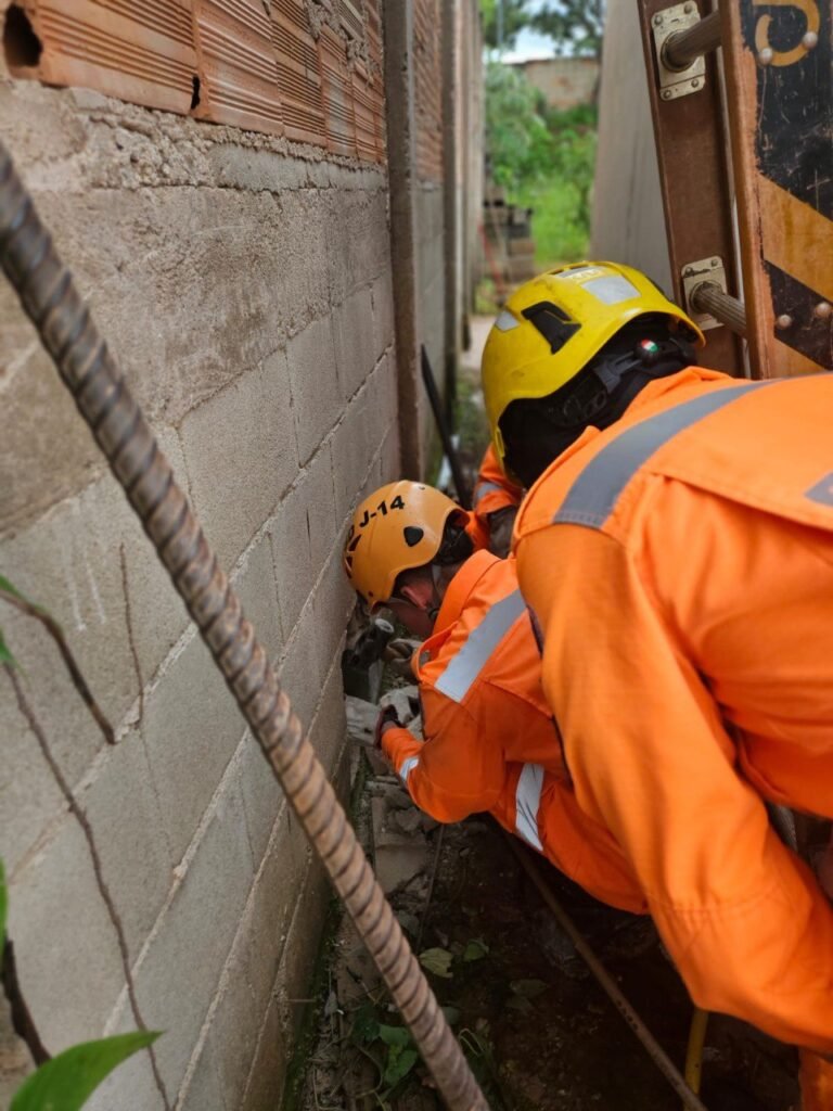 Com autorização da proprietária da residência, a guarnição realizou a quebra de cerca de 1 metro quadrado do muro, possibilitando o resgate seguro do cão.