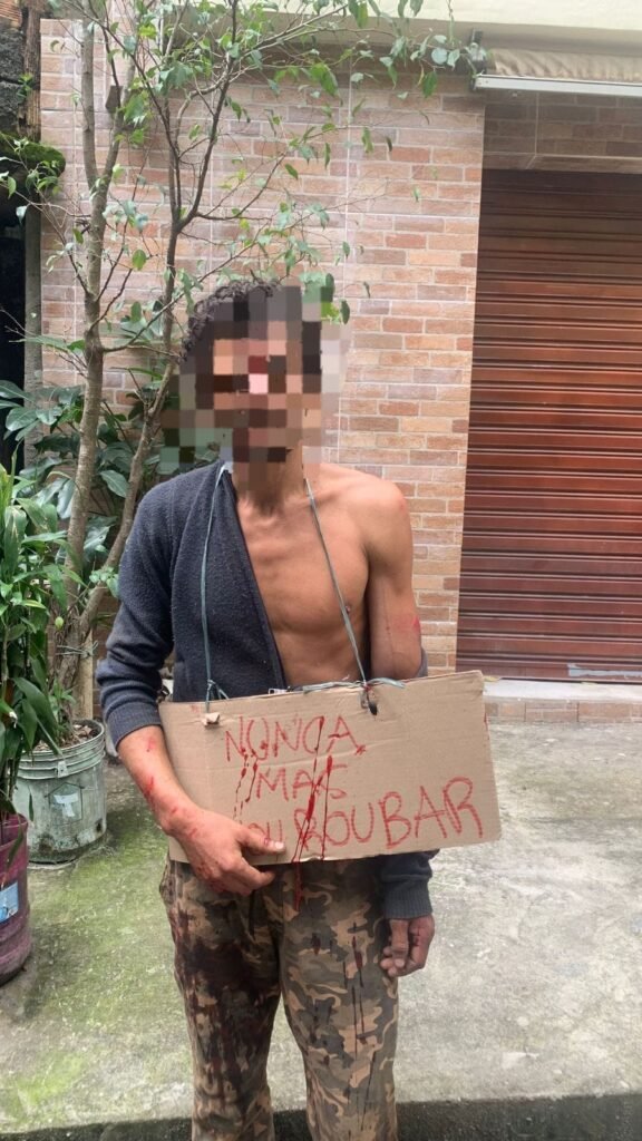 Como vocês podem ver no vídeo acima, depois da surra que inclusive quebrou o seu braço, penduraram uma placa no pescoço escrito, NUNCA MAIS VOU ROUBAR