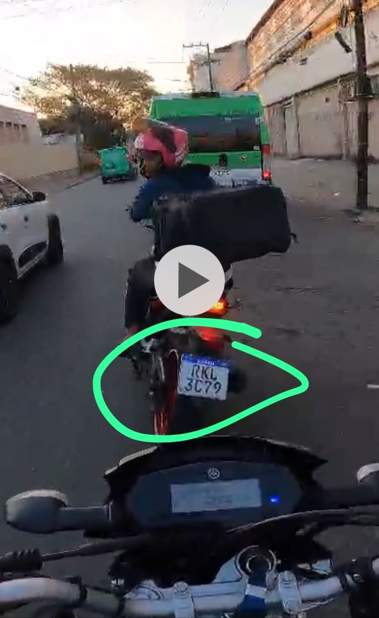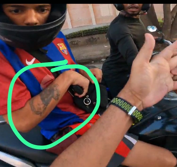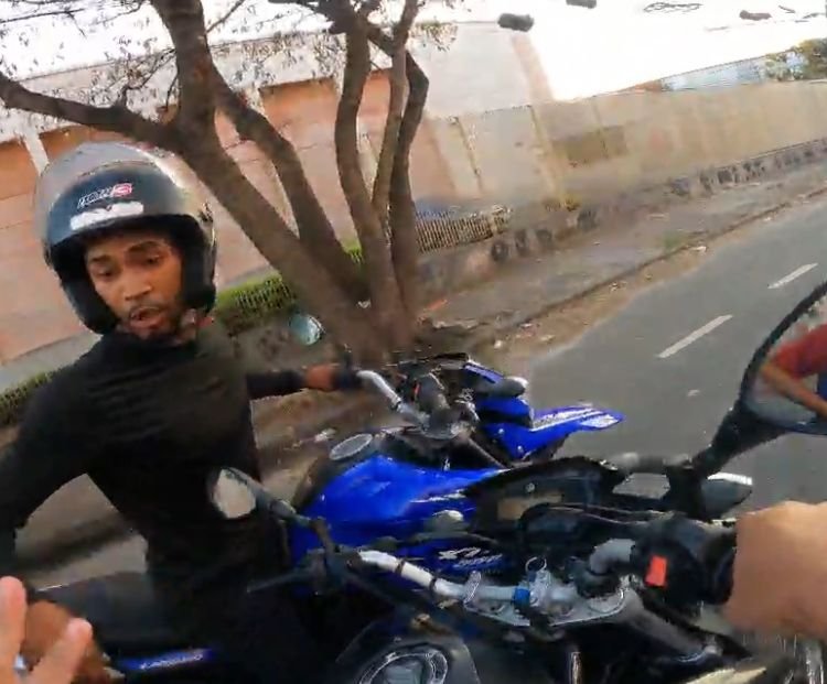 Em seguida dois meliantes em outra motocicleta pararam a vítima no meio da rua, o garupa sacou a arma e apontou para a vítima.