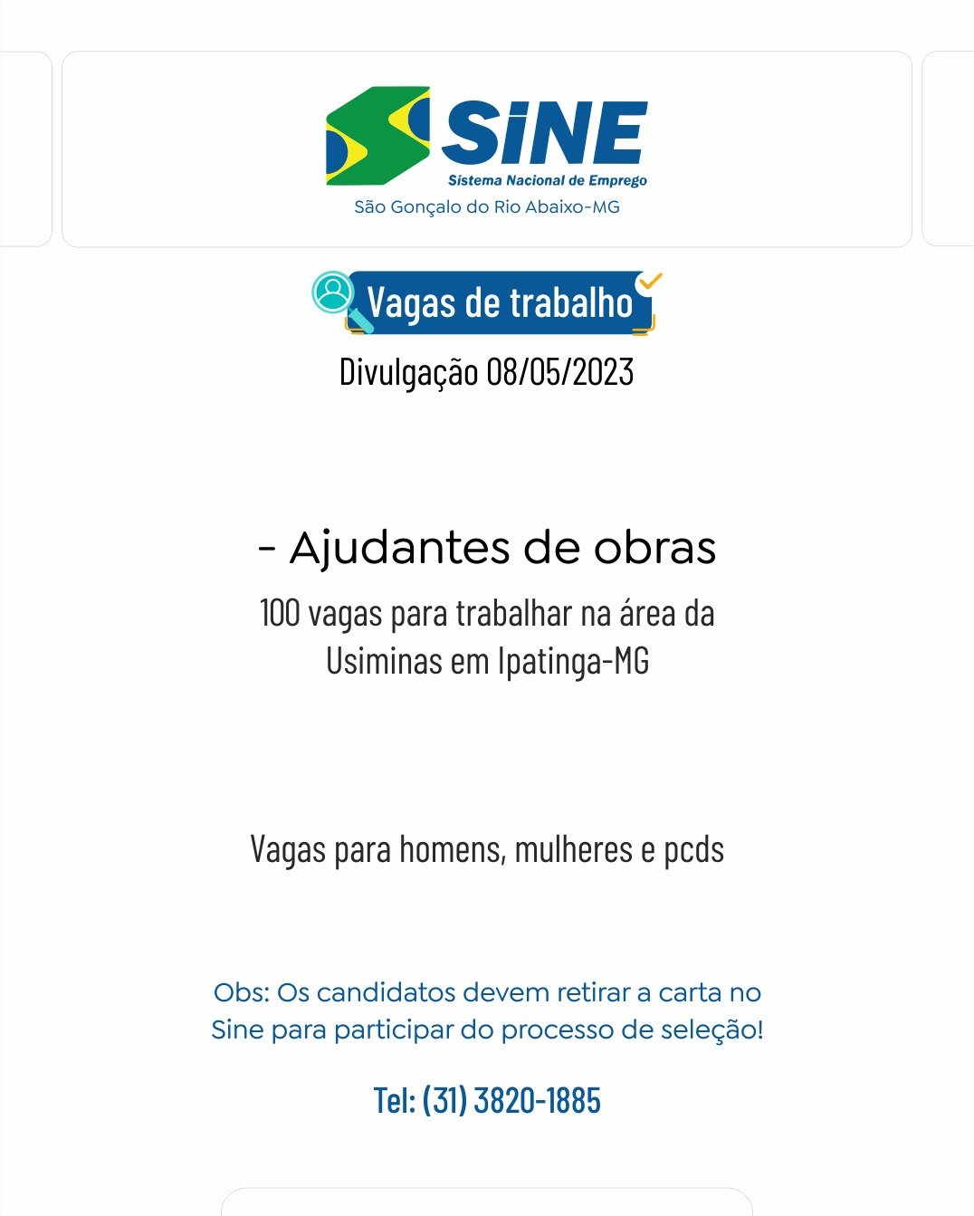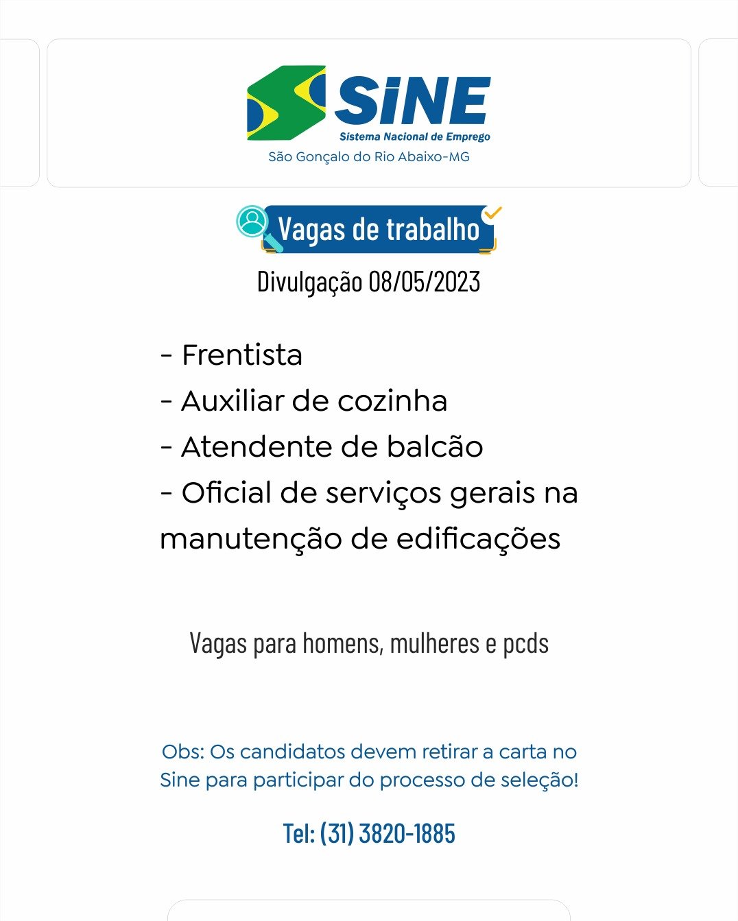 Mais de 100 vagas de emprego no SINE de São Gonçalo do Rio Abaixo
