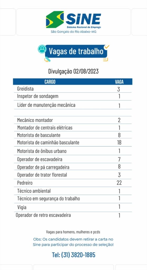 Médio Piracicaba MAIS DE 100 VAGAS DE EMPREGO PARA AMANHÃ DIA 03 DE AGOSTO NO SINE SÃO GONÇALO DO RIO ABAIXO 2 de agosto de 2023 portaldomediopiracicaba@gmail.com Redação