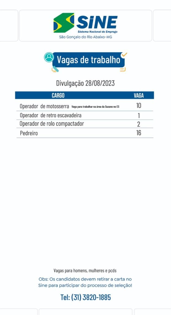 Mais de 150 vagas de emprego no SINE São Gonçalo do Rio Abaixo (#compartilhe)