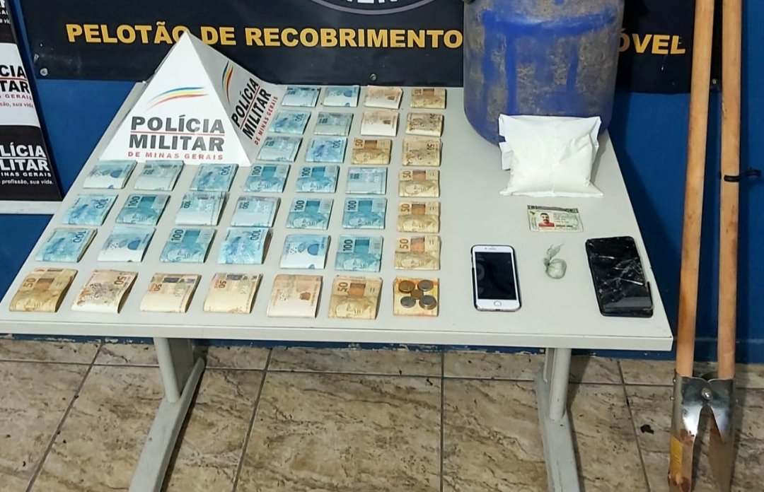 Militares foram ao local apontado na denúncia e avistaram os indivíduos, que ao notarem a presença policial ficaram inquietos, no decorrer da abordagem foram localizados R$ 37.507,95, além de uma porção de cocaína, uma cavadeira, uma leiteira, dois tele fones, uma faca, uma sacola plástica contendo um pó branco.