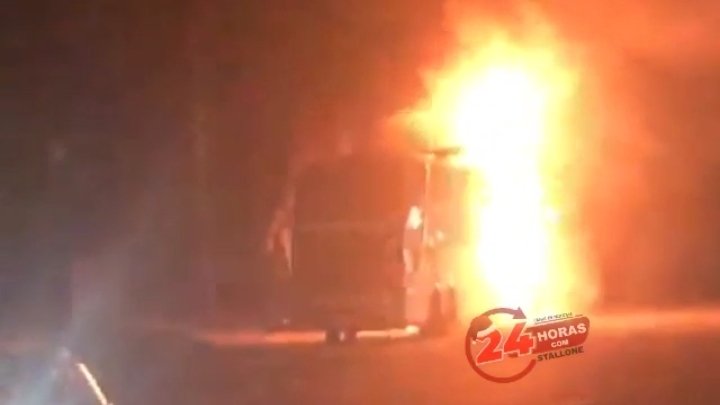 Uma guarnição de Bombeiros deslocou até o local, onde um ônibus de empresa de transporte de passageiros estava tomado em chamas.
