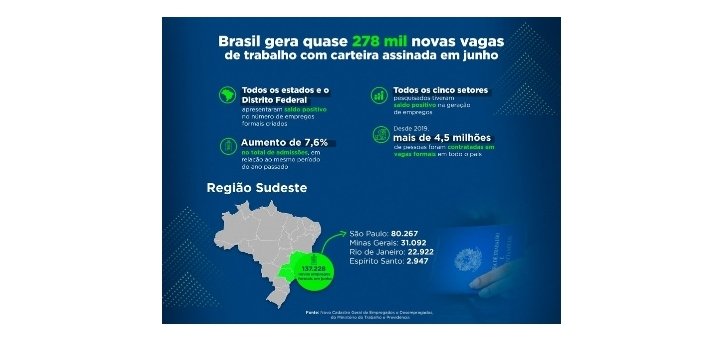 Em junho, o estado de Minas Gerais teve saldo de mais de 31 mil vagas de emprego formais, o segundo maior número do país, ficando atrás apenas de São Paulo com 80,2 mil novos postos. Em todo país, foram abertos mais de 277,9 mil empregos com carteira assinada, segundo dados do Ministério do Trabalho e Previdência.