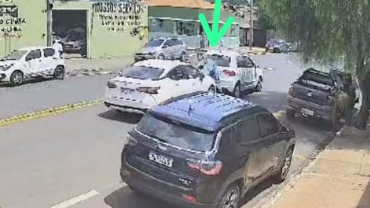 Em seguida, ele cai e é novamente atropelado, ficando com parte do corpo embaixo do veículo. O motorista, então, dá marcha ré e sai.