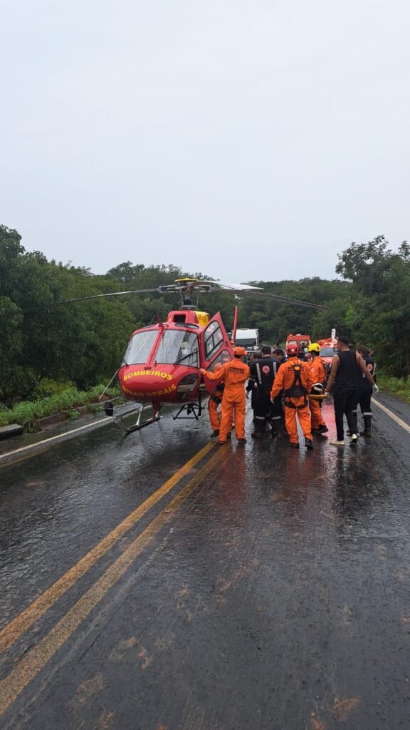 A vítima sobrevivente foi retirada do interior do veículo, devidamente imobilizada em prancha longa e, após avaliação médica no local, foi conduzida pela aeronave Arcanjo 06 para a Santa Casa de Montes Claros.