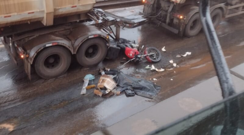 Um motociclista e uma carreta tipo bi-trem colidiram-se e o motociclista foi atropelado pela carreta o que causou a morte instantânea da vítima.
