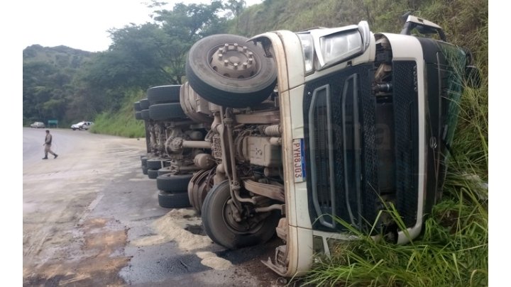 Um Militar da reserva, de 53 anos, era o condutor da carreta que seguia sentido a região metropolitana de Belo Horizonte, quando ao entrar na curva, um dos parafusos que segura o fecho de molas quebrou, fazendo com que a carga puxasse para esquerda pressionando um dos pneus traseiros que estourou, fazendo com que o condutor perdesse o controle da direção invadindo a mão contrária da direção e tombar no acostamento da pista, ele sofreu uma fratura no braço esquerdo, foi retirado da cabine pelos Militares do Corpo de Bombeiros.