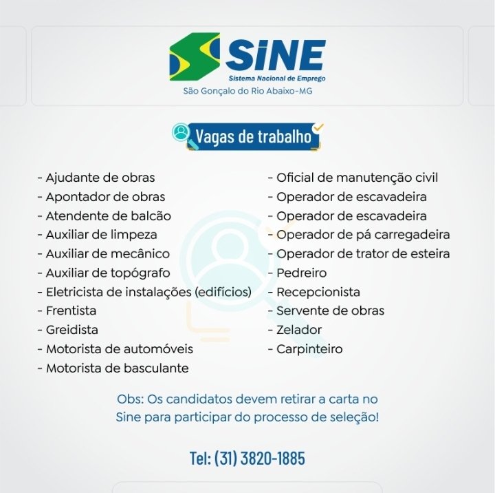 Médio Piracicaba Muitas vagas de emprego no SINE São Gonçalo do Rio Abaixo, Boa sorte aos candidatos (#compartilhe) 20 de setembro de 2022 portaldomediopiracicaba@gmail.com Redação