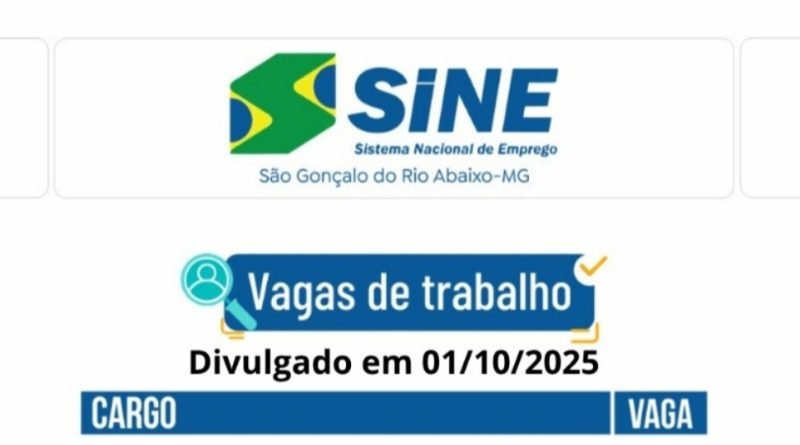 Muitas vagas de emprego para está quarta-feira (01/10) no SINE São Gonçalo do Rio Abaixo (Boa sorte aos candidatos)