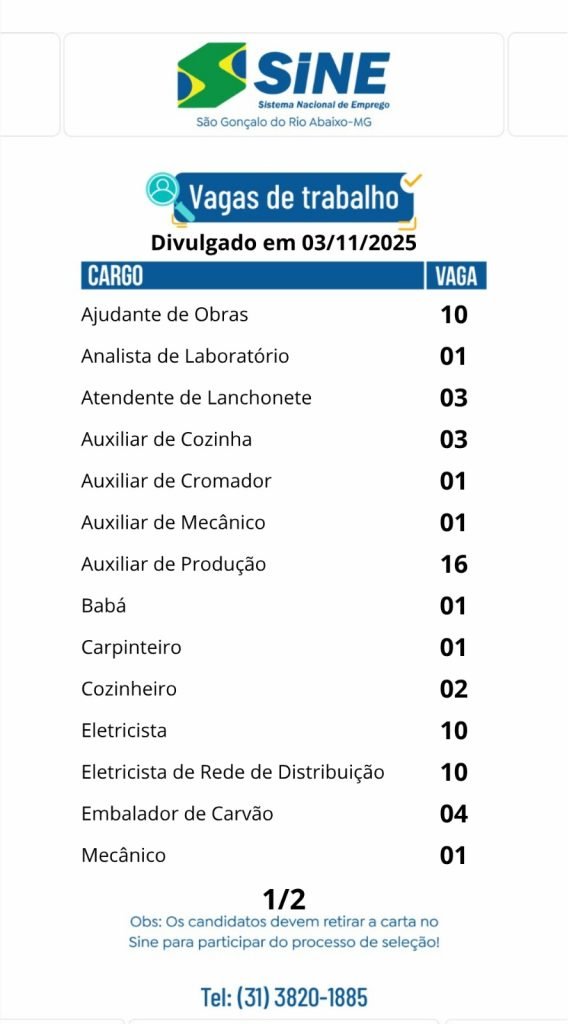 Médio Piracicaba Muitas vagas de emprego para está segunda-feira (03) de novembro no SINE São Gonçalo do Rio Abaixo (Boa sorte aos candidatos) 3 de novembro de 2025 portaldomediopiracicaba@gmail.com Redação