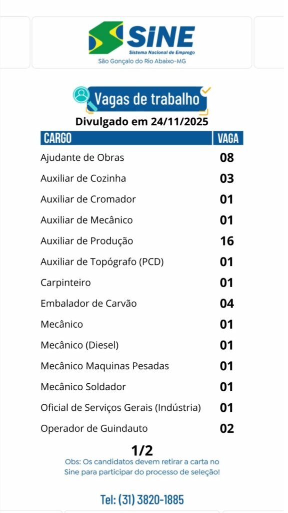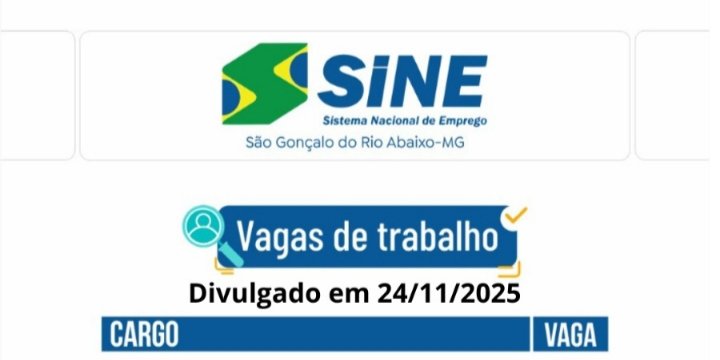 Médio Piracicaba Muitas vagas de emprego para está segunda-feira (24/11) no SINE São Gonçalo do Rio Abaixo 24 de novembro de 2025 portaldomediopiracicaba@gmail.com Redação