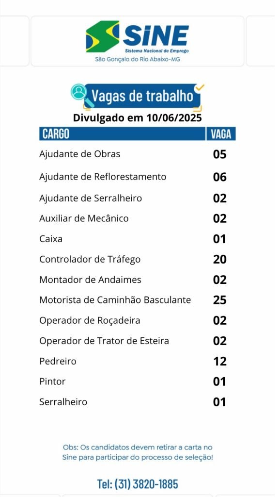 MUITAS VAGAS DE EMPREGO PARA ESTÁ TERÇA-FEIRA (10/06) NO SINE SÃO GONÇALO DO RIO ABAIXO (BOA SORTE AOS CANDIDATOS)