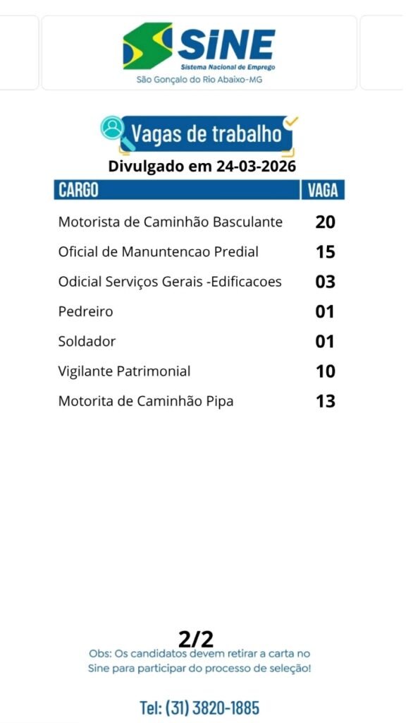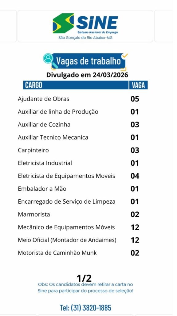 Médio Piracicaba MUITAS VAGAS DE EMPREGO PARA HOJE (24/03) NO SINE SÃO GONÇALO DO RIO ABAIXO 24 de março de 2026 portaldomediopiracicaba@gmail.com Redação