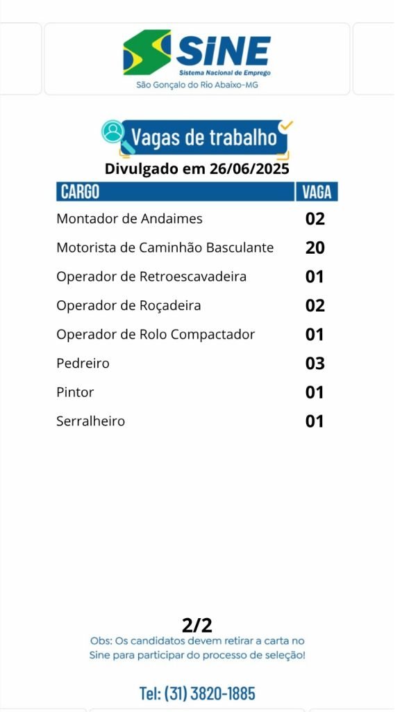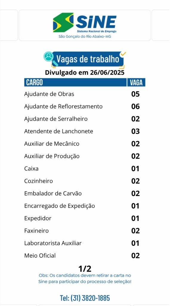 Médio Piracicaba Muitas vagas de emprego para hoje (26/06) no SINE São Gonçalo do Rio Abaixo (Boa sorte aos candidatos) 26 de junho de 2025 portaldomediopiracicaba@gmail.com Redação