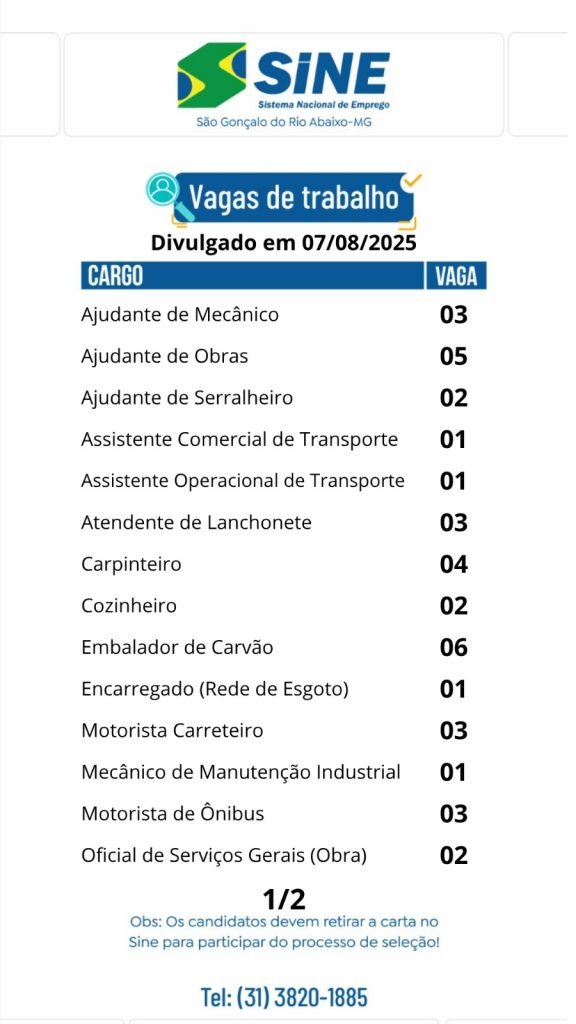 Médio Piracicaba Muitas vagas de emprego para hoje, no SINE São Gonçalo do Rio Abaixo (Boa sorte aos candidatos) 7 de agosto de 2025 portaldomediopiracicaba@gmail.com Redação