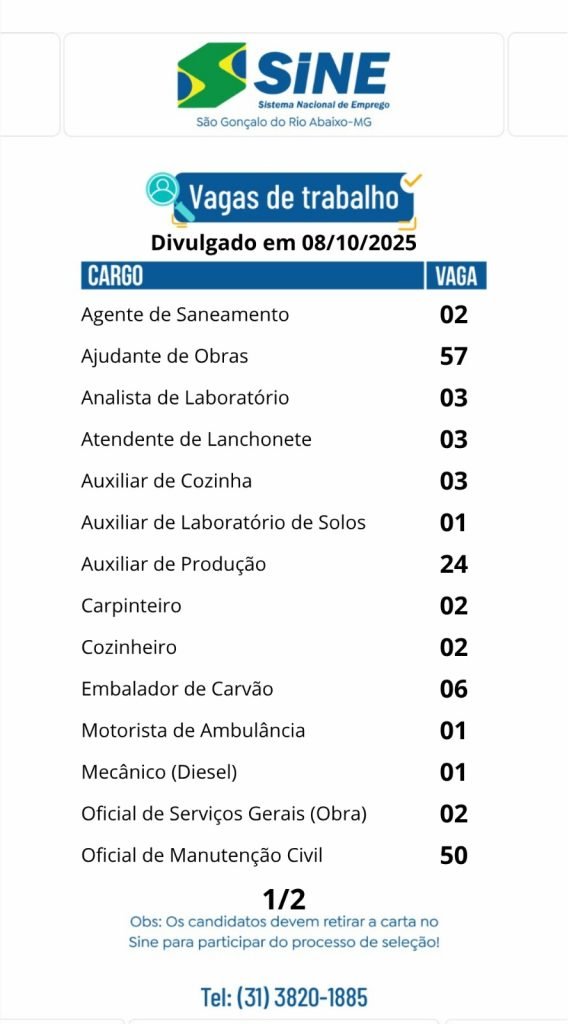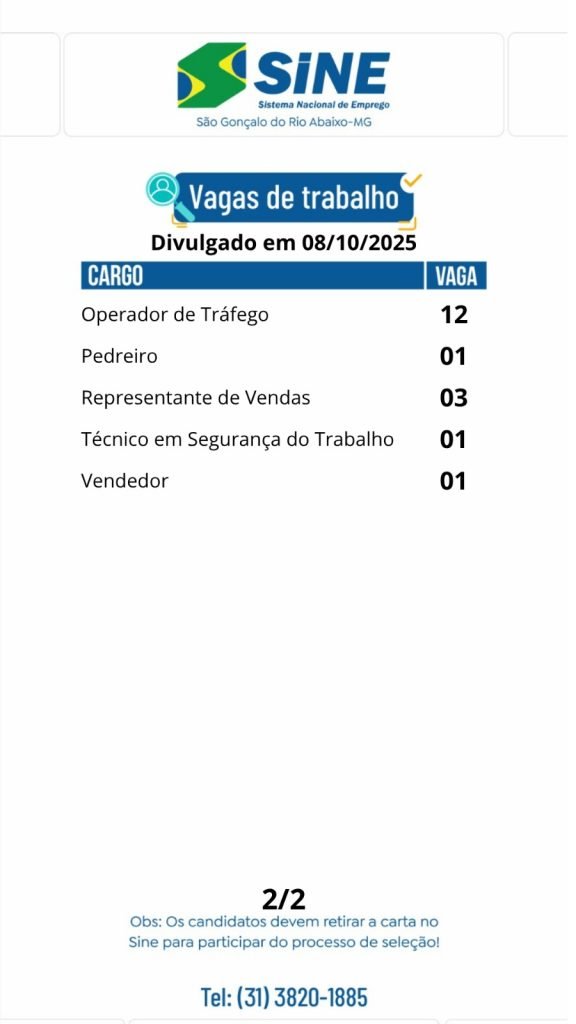 Médio Piracicaba Muitas vagas de emprego para hoje, quarta-feira (08/10) no SINE São Gonçalo do Rio Abaixo (Boa sorte aos candidatos) 8 de outubro de 2025 portaldomediopiracicaba@gmail.com Redação