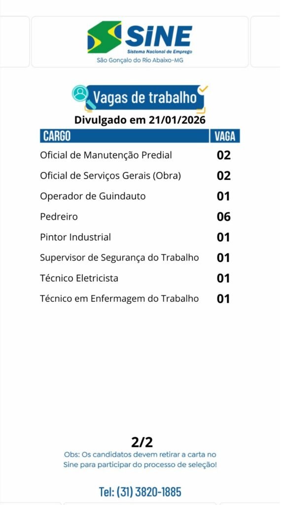 Muitas vagas de emprego para hoje, quarta-feira (21/01) no SINE São Gonçalo do Rio Abaixo (@boa sorte)
