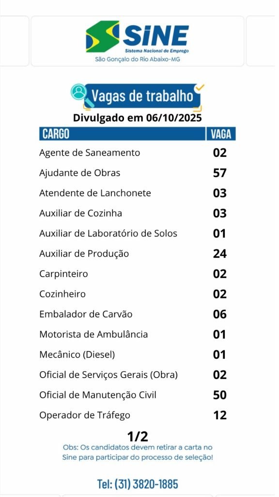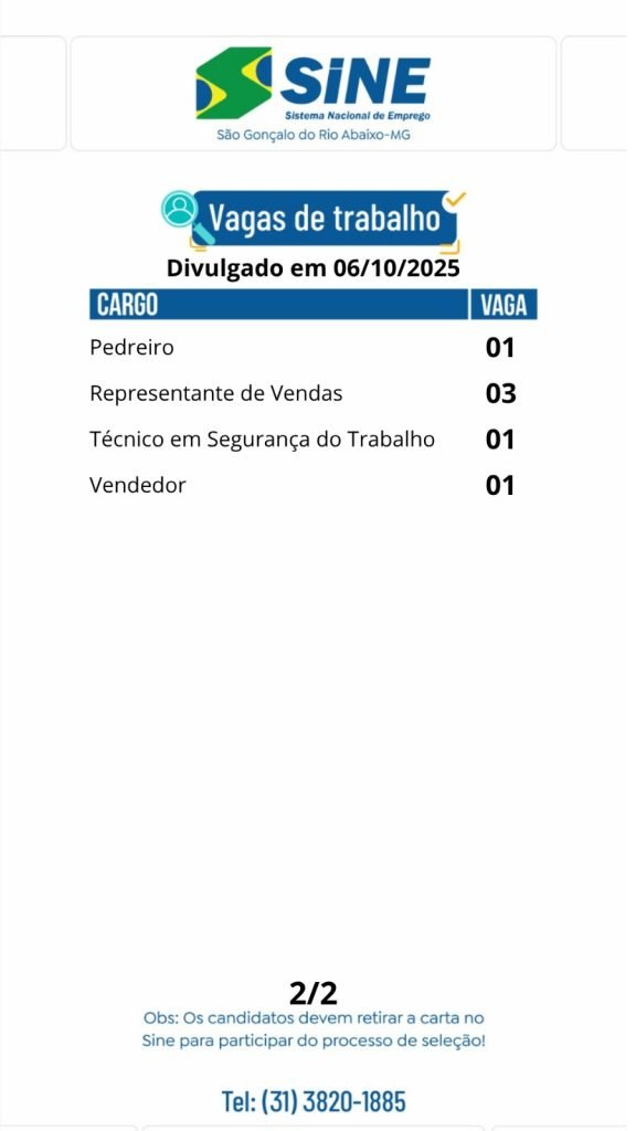 Médio Piracicaba Muitas vagas de emprego para hoje, segunda-feira (06/10) no SINE São Gonçalo do Rio Abaixo (Boa sorte aos candidatos) 6 de outubro de 2025 portaldomediopiracicaba@gmail.com Redação