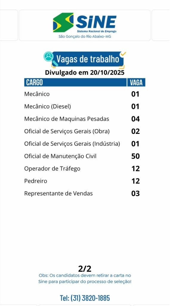 Médio Piracicaba Muitas vagas de emprego para hoje, segunda-feira (20/10) no SINE São Gonçalo do Rio Abaixo (Boa sorte aos candidatos) 20 de outubro de 2025 portaldomediopiracicaba@gmail.com Redação