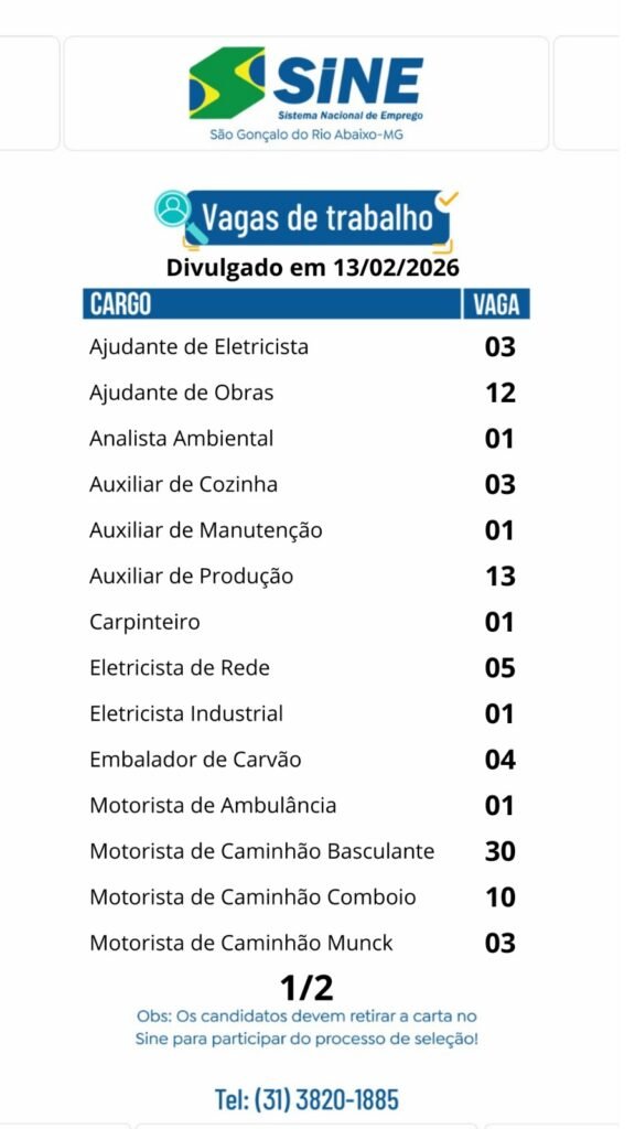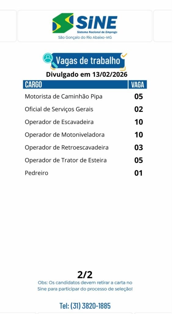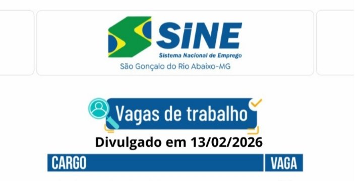 Médio Piracicaba Muitas vagas de emprego para hoje, sexta-feira (13) de fevereiro no SINE São Gonçalo do Rio Abaixo (Boa sorte aos candidatos) 13 de fevereiro de 2026 portaldomediopiracicaba@gmail.com Redação