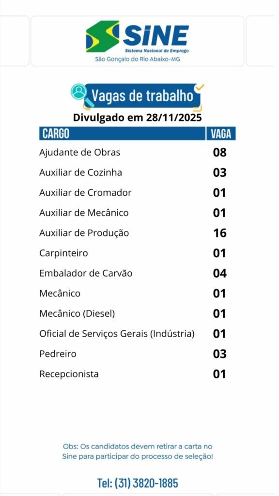 Médio Piracicaba Muitas vagas de emprego para hoje sexta-feira (28) no SINE São Gonçalo do Rio Abaixo (Boa sorte aos candidatos) 28 de novembro de 2025 portaldomediopiracicaba@gmail.com Redação