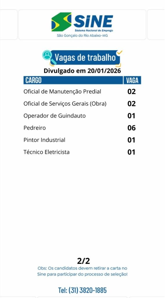Médio Piracicaba Muitas vagas de emprego para hoje, terça-feira (20) de janeiro no SINE São Gonçalo do Rio Abaixo (Boa sorte aos candidatos) 20 de janeiro de 2026 portaldomediopiracicaba@gmail.com Redação